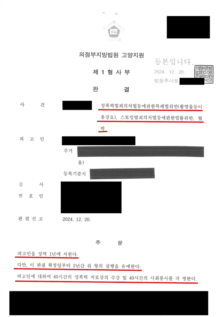 그 결과 재판부는 가해자의 혐의를 인정하여 징역 1년에 집행유예 2년을 선고하고, 치료강의 수강과 사회봉사를 명했습니다.