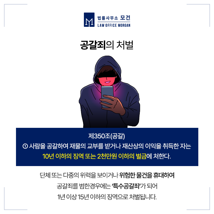 본 범죄는 사람을 공갈하여 재물의 교부를 받거나 재산상의 이익을 취득한 자를 10년 이하의 징역 또는 2천만원 이하의 벌금으로 처하는 범죄입니다.