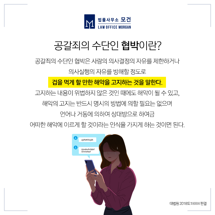 여기서 말하는 '해악의 고지'라는 것은 상대방의 의사결정의 자유를 제한하거나 의사실행의 자유를 방해할 정도로 겁을 먹게 할 정도로 협박하는 것을 말하는데요. 이를 통해 금전을 취득하였다면 공갈협박죄로 처벌될 수 있는 것입니다.