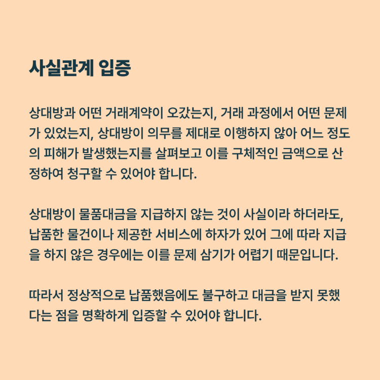 만일 물품대금 미지급으로 인해 문제가 발생했고, 받지 못한 금액을 다시 지급받고자 한다면 사실관계를 명확하게 입증해야 합니다. 상대방과 어떤 거래계약이 오갔는지, 거래 과정에서 어떤 문제가 있었는지, 상대방이 의무를 제대로 이행하지 않아 어느 정도의 피해가 발생했는지를 살펴보고 이를 구체적인 금액으로 산정하여 청구할 수 있어야 합니다.
