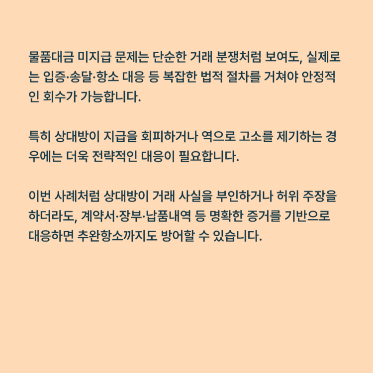 물품대금 미지급 문제는 단순한 거래 분쟁처럼 보여도, 실제로는 입증·송달·항소 대응 등 복잡한 법적 절차를 거쳐야 안정적인 회수가 가능합니다. 특히 상대방이 지급을 회피하거나 역으로 고소를 제기하는 경우에는 더욱 전략적인 대응이 필요합니다.