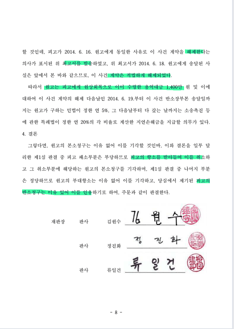 오히려 기지급한 용역대금 반환하라는 피고의 반소 인용