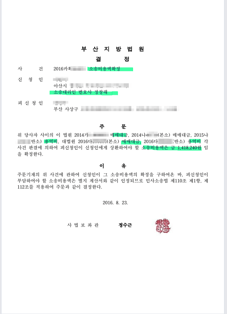 이에 따라 소송비용 확정신청을 하여 모든 변호사 비용 받아낸 사례