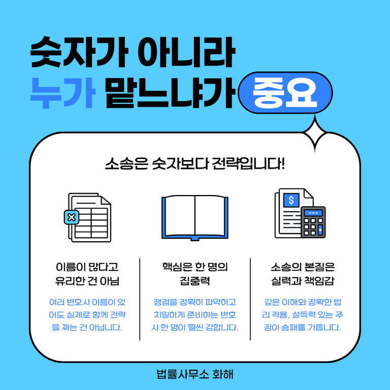 결국 소송의 승패를 가르는 것은 사건에 대한 깊이 있는 이해, 정확한 법리 적용, 그리고 설득력 있는 주장입니다. 이름만 많이 올라가 있고 정작 누구도 책임감 있게 사건을 다루지 않는다면, 그것은 오히려 약점이 될 수도 있습니다.