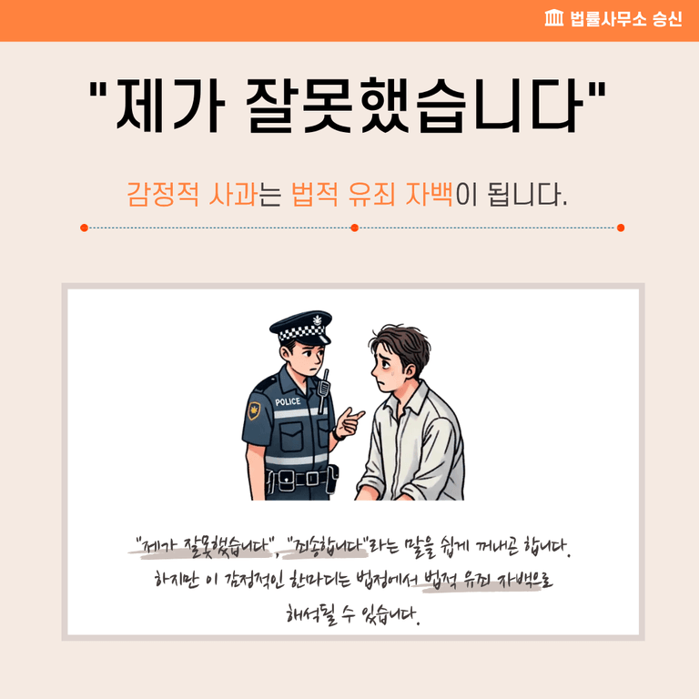 2. 감정적 사과는 법적 책임 인정이 아님을 명심하고, 성급한 자백은 절대 피하셔야 합니다.