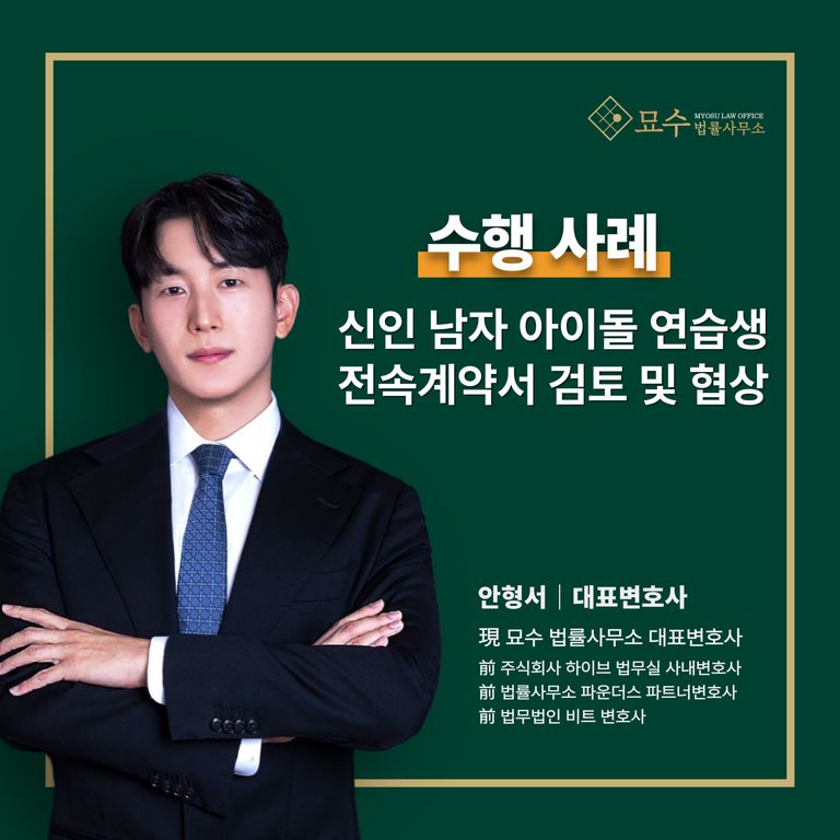 전속계약을 앞둔 연습생이나 신인 아티스트라면, 엔터테인먼트 산업 관련 법리와 최신 업계 동향을 깊이 이해하고 있는 안형서 변호사의 조력을 받아, 자신의 권리와 이익이 균형 있게 보장되는 계약을 체결하시길 권합니다.