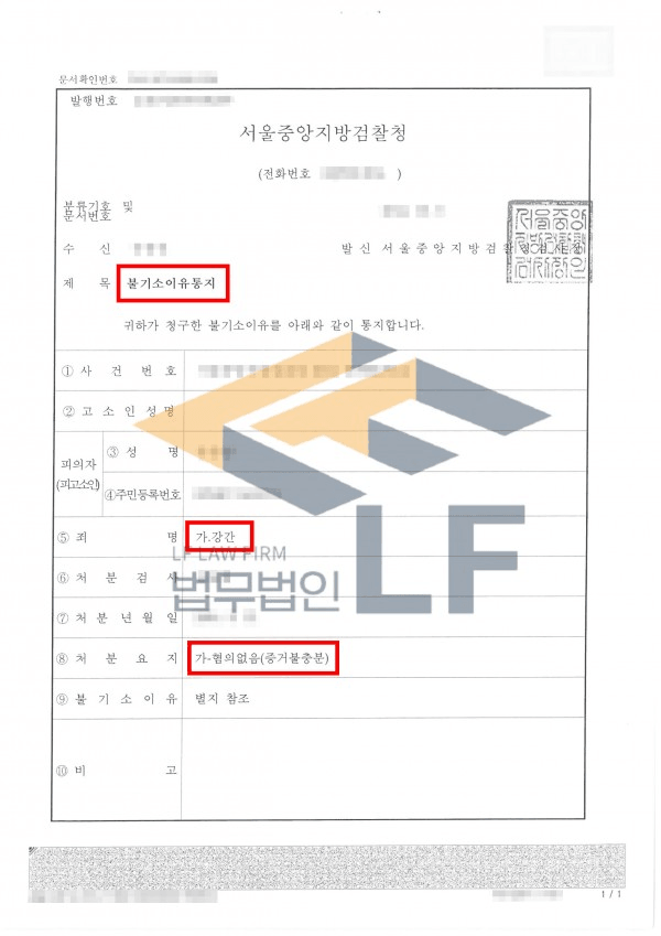 그 결과 수사기관은 변호인의견서와 증거자료들을 종합해본 결과 강간죄를 구성하는 데 있어 모순점이 존재하여 혐의없음(증거불충분)으로 종결하였습니다.