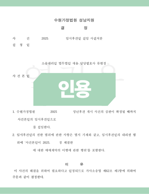 이와 같이 적극적으로 나선 결과 수임 후 30일도 되지 않은 상황에서 빠르게 임시후견인 지정이 될 수 있었습니다. 한정후견인이나 성년후견의 경우 지정에 있어 시간이 오래 소요될 수밖에 없습니다. 그렇기에 조금이라도 더 빠르게 필요한 권리의 행사를 위해 우선 임시후견을 신청하고 필요한 법적 권리행사 및 피후견인의 업무처리를 할 수 있도록 해야 했는데요. 의뢰인이 처한 상황을 명확하게 파악하고 대응한 결과 신속하게 결과를 이끌어낼 수 있었고 무사히 필요한 업무가 진행될 수 있도록 도움을 받을 수 있었습니다.