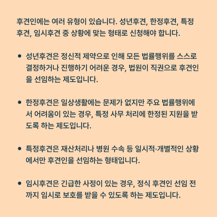 이처럼 피후견인의 사정과 도움이 필요한 영역을 세밀히 살핀 후 적절한 제도를 선택하면, 보다 안정적이고 합법적인 보호가 가능합니다.