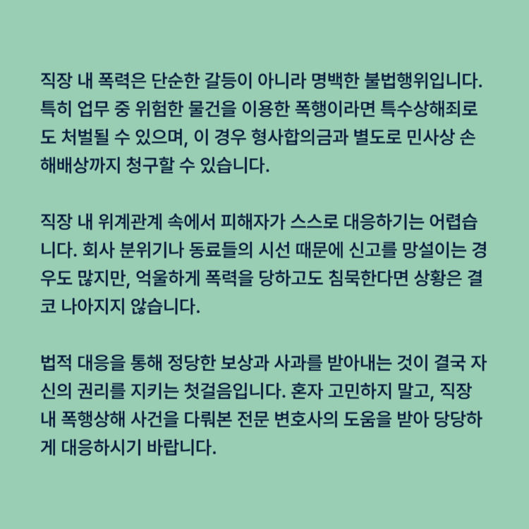 직장 내 폭력은 단순한 갈등이 아니라 명백한 불법행위입니다. 특히 업무 중 위험한 물건을 이용한 폭행이라면 특수상해죄로도 처벌될 수 있으며, 이 경우 형사합의금과 별도로 민사상 손해배상까지 청구할 수 있습니다.