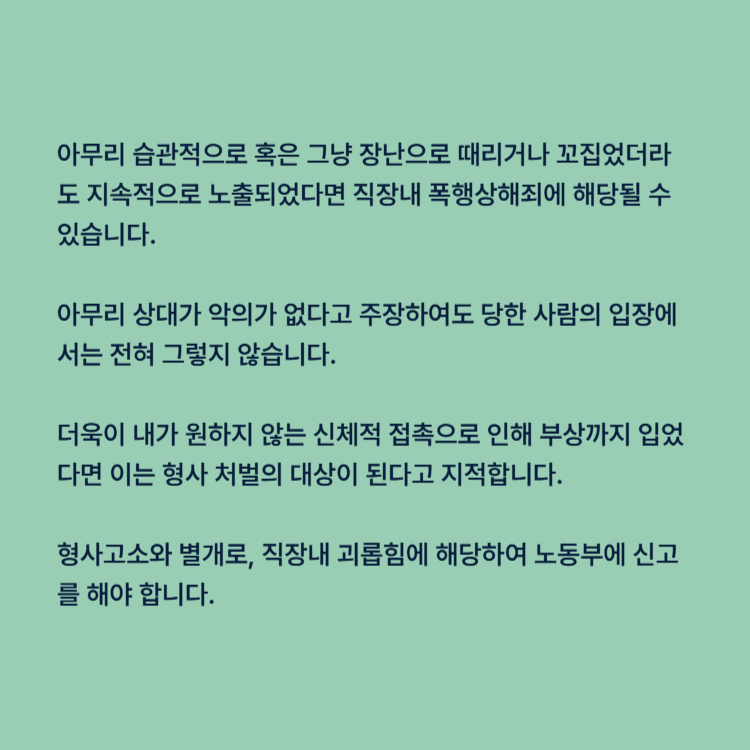 아무리 상대가 악의가 없다고 주장하여도 당한 사람의 입장에서는 전혀 그렇지 않습니다. 더욱이 내가 원하지 않는 신체적 접촉으로 인해 부상까지 입었다면 이는 형사 처벌의 대상이 된다고 지적합니다. 전문가들은 형사고소와 별개로, 직장내 괴롭힘에 해당하여 노동부에 신고를 해야 한다고 덧붙였습니다.