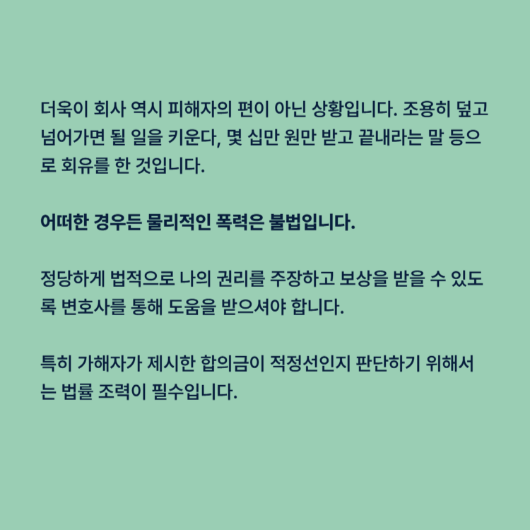 더욱이 회사 역시 피해자의 편이 아닌 상황입니다. 조용히 덮고 넘어가면 될 일을 키운다, 몇 십만 원만 받고 끝내라는 말 등으로 회유를 한 것입니다.
