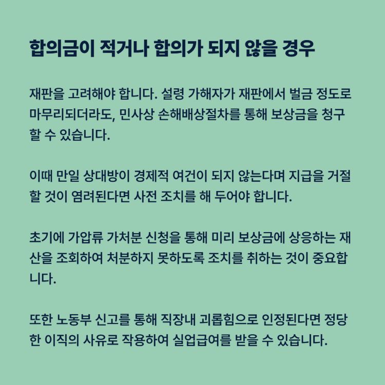 민사소송 초기에 가압류 가처분 신청을 통해 미리 보상금에 상응하는 재산을 조회하여 처분하지 못하도록 조치를 취하는 것이 중요합니다. 또한 노동부 신고를 통해 직장내 괴롭힘으로 인정된다면 정당한 이직의 사유로 작용하여 실업급여를 받을 수 있습니다.