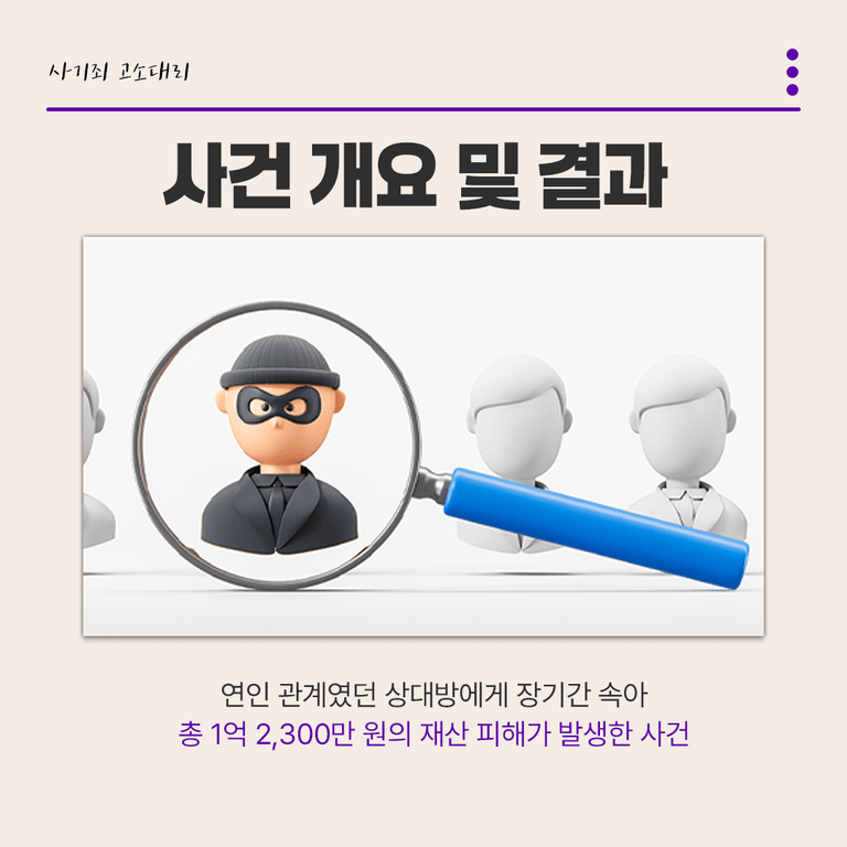 연인 관계였던 상대방에게 장기간 속아 총 1억 2,300만 원의 재산 피해가 발생한 사건이었습니다.