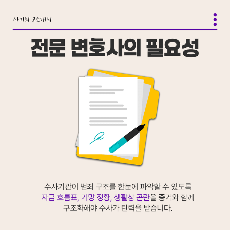 즉시 주목할 포인트(계좌 흐름, 기망 패턴, 공모 정황)를 전면에 배치합니다.피해자 서사의 법적 언어화 : 여성 변호사로서의 섬세함을 살려 심리적·정서적 피해를 객관적 자료와 함께