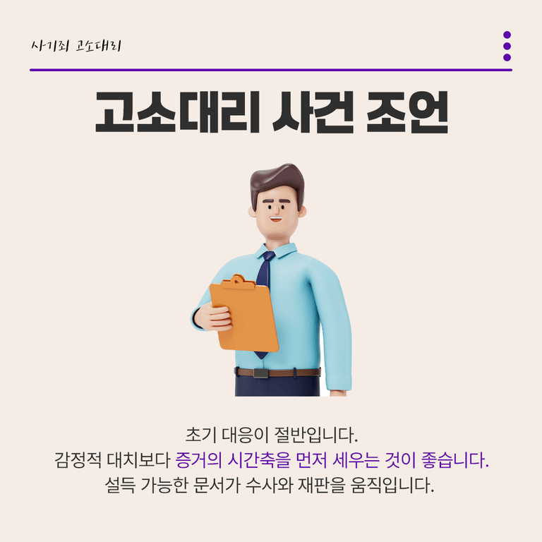 초기 대응이 절반입니다. 감정적 대치보다 증거의 시간축을 먼저 세우는 것이 좋습니다.