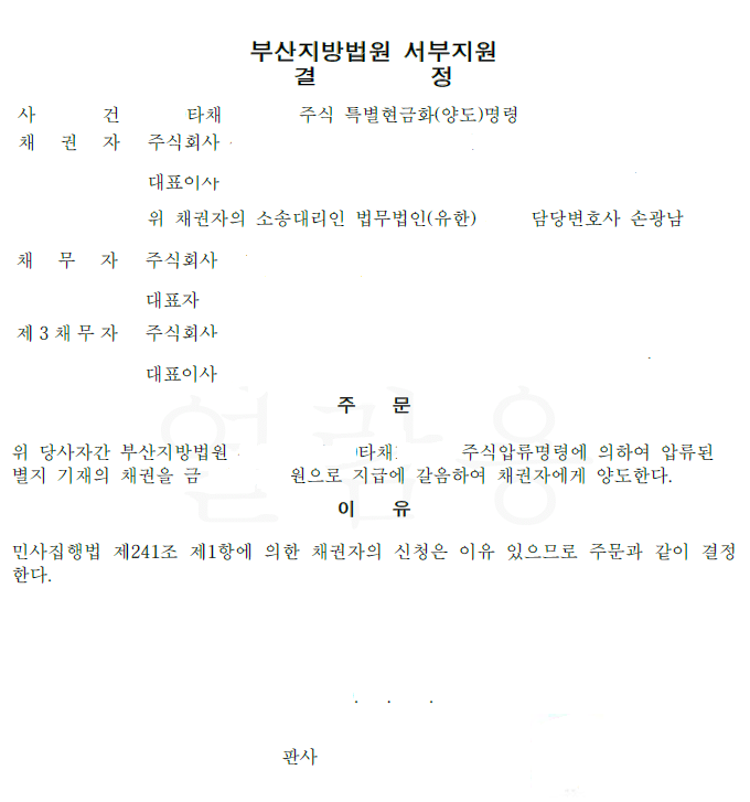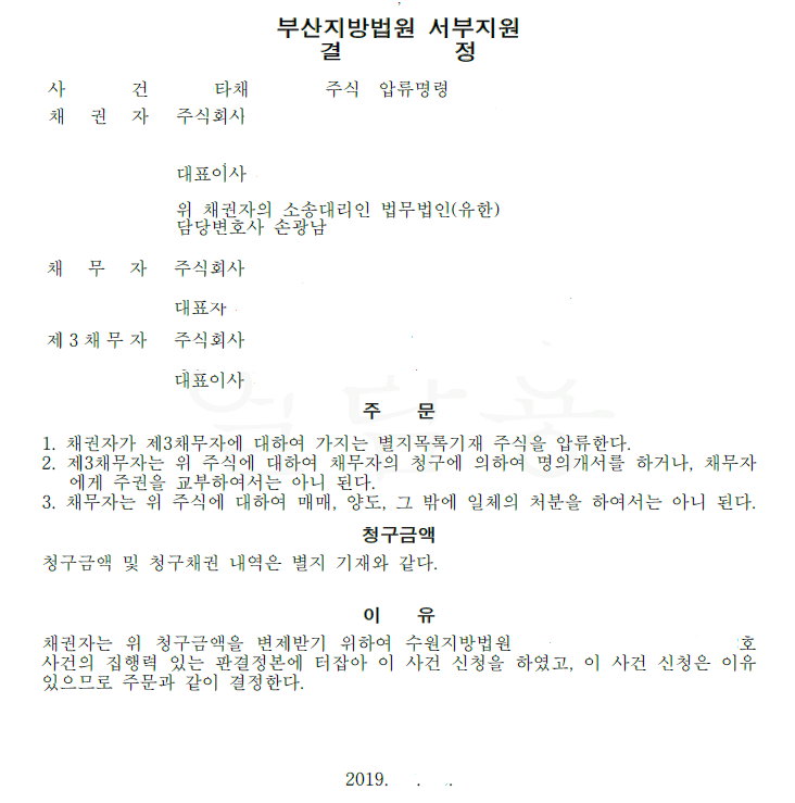 아래는 최근에 제가 주식 압류명령신청을 하여 #비상장 주식에 대해 압류 명령을 받은 것입니다.
