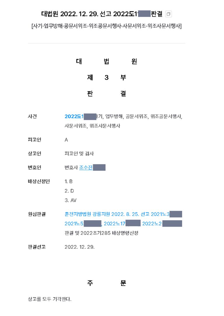 판결: 검사의 상고 기각으로 '무죄 부분' 최종 확정