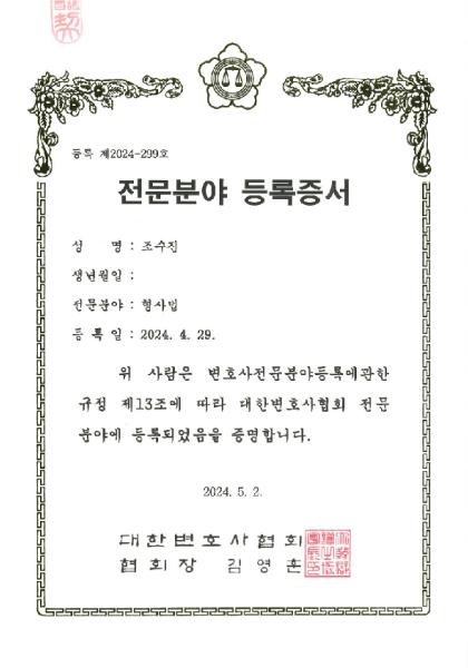 안녕하세요. 형사 사건 전문 조수진 변호사입니다.