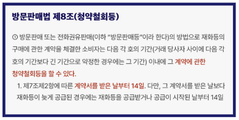 하지만 이러한 불리한 조건 속에서도 수분양자가 행사할 수 있는 중요한 권리 중 하나가 있습니다. 바로 「방문판매 등에 관한 법률」 제8조에 따른 청약철회권입니다. 이 조항에 따르면, 소비자는 계약서를 받은 날로부터 14일 이내에는 청약을 철회할 수 있으며, 이로 인해 위약금이나 손해배상을 청구당하지 않습니다. 즉, 방문판매나 전화 권유 판매, 다단계 판매 등의 방식으로 계약이 이루어진 경우에는 계약 체결 후 14일 이내라면 단순한 변심만으로도 자유롭게 청약을 철회할 수 있습니다.
