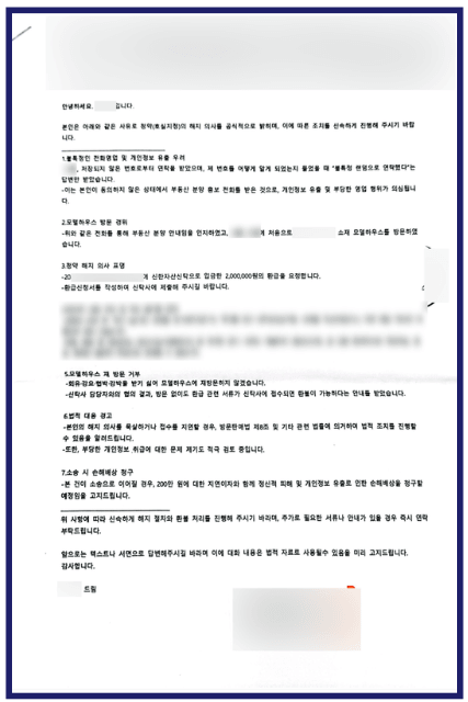 최동욱 변호사의 검토 결과, 의뢰인은 방문판매법상 청약 철회가 가능한 유형에 해당하였습니다. 이에 따라 의뢰인은 최동욱 변호사의 조력을 받아 시행사에 계약 해제 의사를 명확히 알리는 내용증명을 작성하여 전달하였습니다.이 절차를 통해 의뢰인은 법적으로 인정되는 방식으로 청약 철회 의사를 통지하였고, 이후 시행사와의 분쟁에도 법적 근거를 갖춘 상태에서 대응할 수 있게 되었습니다.