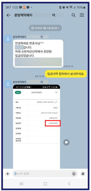 하지만 의뢰인이 정해진 기간 내에 청약 철회의사를 적법하게 통보했음에도 불구하고, 시행사 측은 끝까지 이를 받아들이지 않았습니다. 이에 최동욱 변호사는 의뢰인을 대신하여 시행사를 상대로 민사소송을 제기하였고, 소송을 통해 시행사에 법적 책임을 명확히 묻는 절차를 진행했습니다. 이에 압박을 느낀 시행사 측은 최동욱 변호사의 주장을 모두 수용하며, 의뢰인의 계약을 전면 해지하고 이미 납부한 계약금 1천만 원을 전액 반환하겠다는 의사를 밝혔습니다. 그 결과, 의뢰인은 2025년 4월 11일에 납입금 1천만 원을 전액 돌려받고 분양계약을 해지함으로써 사건을 성공적으로 마무리할 수 있었습니다.
