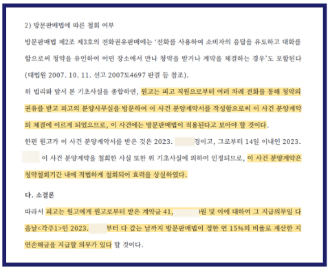 이 사례와 같이, 사업장이 아닌 외부 장소에서 홍보 직원의 권유로 계약 체결 장소로 이동해 계약을 하였거나, 전화나 문자 권유를 통해 계약이 이루어진 경우에는 단순 변심이라도 14일 이내에 청약을 철회하고 납입금을 돌려받을 수 있습니다. 다만 시행사가 이를 끝까지 거부할 경우, 소송을 제기해야 하는 상황이 생길 수 있습니다. 실제로 방문판매법을 근거로 한 청약 철회와 관련해 법원은 여러 유사한 사례에서 수분양자에게 유리한 판결을 계속 내리고 있습니다. 따라서 시행사가 반환을 거부하는 경우에는 소송을 통한 계약 해제가 수분양자가 취할 수 있는 현실적이고 효과적인 대응 방법이 될 수 있습니다.