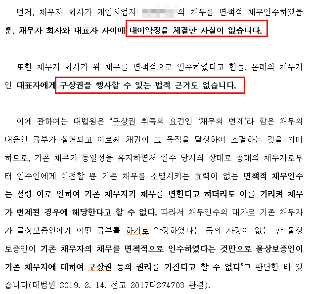 반면 면책적 채무인수라면, 채무를 넘긴 개인(대표자)은 채무자의 지위에서 탈퇴하고, 법인이 추후 그 채무를 변제한다고 하더라도 기존의 채무자(개인사업자였던 대표자)에게 구상권을 행사할 여지가 없다.