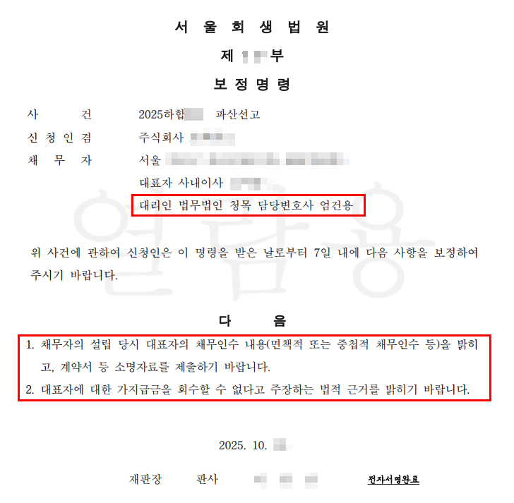 본 건은 재판부에서 몇 건의 보정명령을 내렸는데, 모두 개인사업자의 법인 전환 과정에서 발생한 '가지급금' 계정에 관한 것이었다. 개인사업자의 대출을 법인이 채무인수하면서 '가지급금'으로 처리되었는데, 그러한 회계처리의 정당성에 대한 소명 요구가 있었던 것이다.