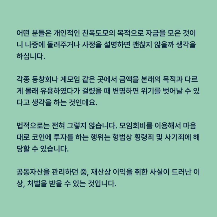 법적으로는 전혀 그렇지 않습니다. 위 사건에서도 변호사들은 모임회비를 이용해서 마음대로 코인에 투자를 하는 행위는 형법상 횡령죄 및 사기죄에 해당한다고 지적하였습니다. 총무로 역할을 맡아 공동자산을 관리하던 중, 신의칙을 위배하여 마음대로 재산상 이익을 취한 사실이 드러난 이상, 처벌을 받을 수 있는 것입니다.
