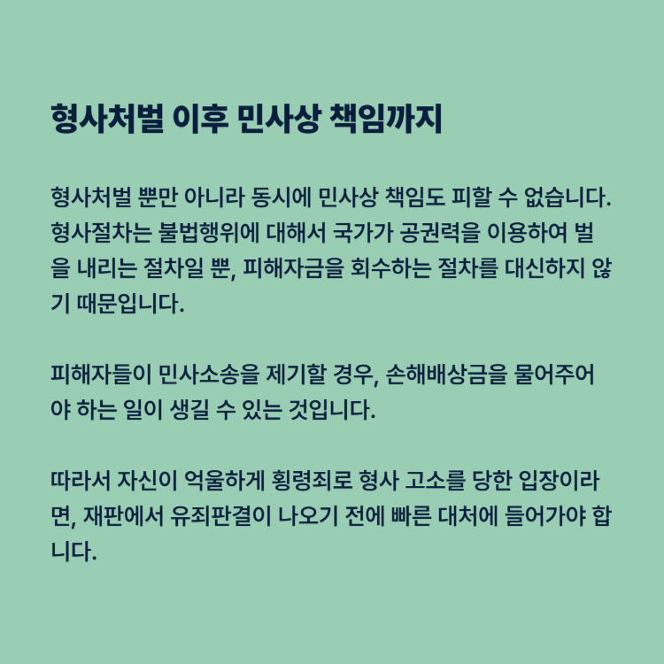 이에 피해를 입은 이들이 단체로 민사소송을 제기할 경우 거액의 손해배상금을 물어주어야 하는 일이 생길 수 있는 것입니다. 따라서 자신이 형사고소를 당한 입장이라면, 재판에서 유죄판결이 나오기 전에 빠른 대처에 들어가야 합니다.