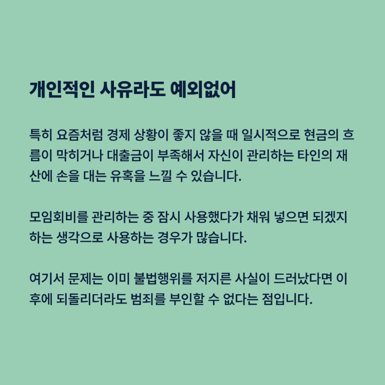 어떤 분들은 개인적인 친목도모의 목적으로 자금을 모은 것이니 나중에 돌려주거나 사정을 설명하면 괜찮지 않을까 생각을 하십니다. 각종 동창회나 계모임 같은 곳에서 금액을 본래의 목적과 다르게 몰래 유용하였다가 걸렸을 때 변명하면 위기를 벗어날 수 있다고 생각을 하는 것인데요.