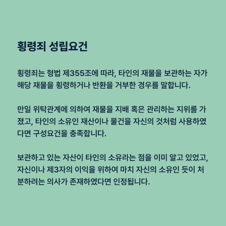 만일 위탁관계에 의하여 재물을 지배 혹은 관리하는 지위를 가졌고, 타인의 소유인 재산이나 물건을 자신의 것처럼 사용하였다면 구성요건을 충족합니다. 보관하고 있는 자산이 타인의 소유라는 점을 이미 알고 있었고, 자신이나 제3자의 이익을 위하여 마치 자신의 소유인 듯이 처분하려는 의사가 존재하였다면 인정됩니다.