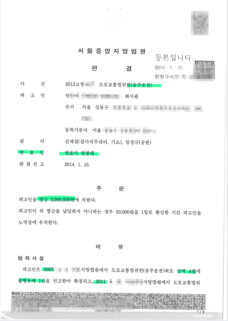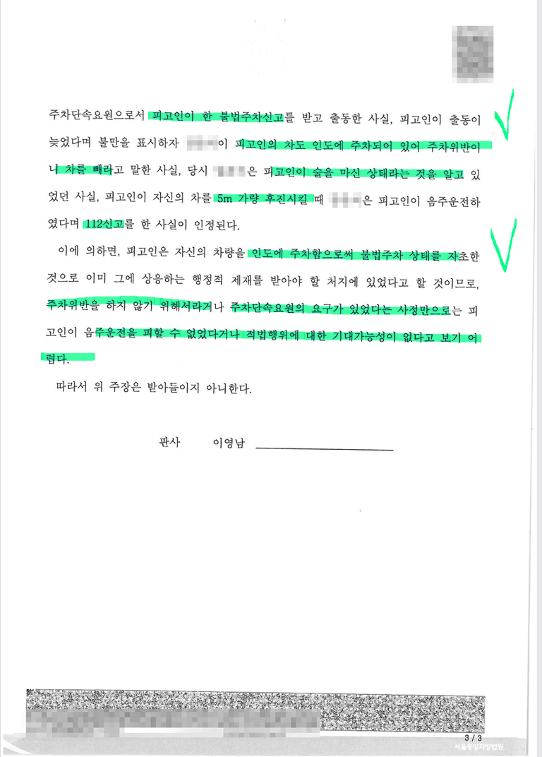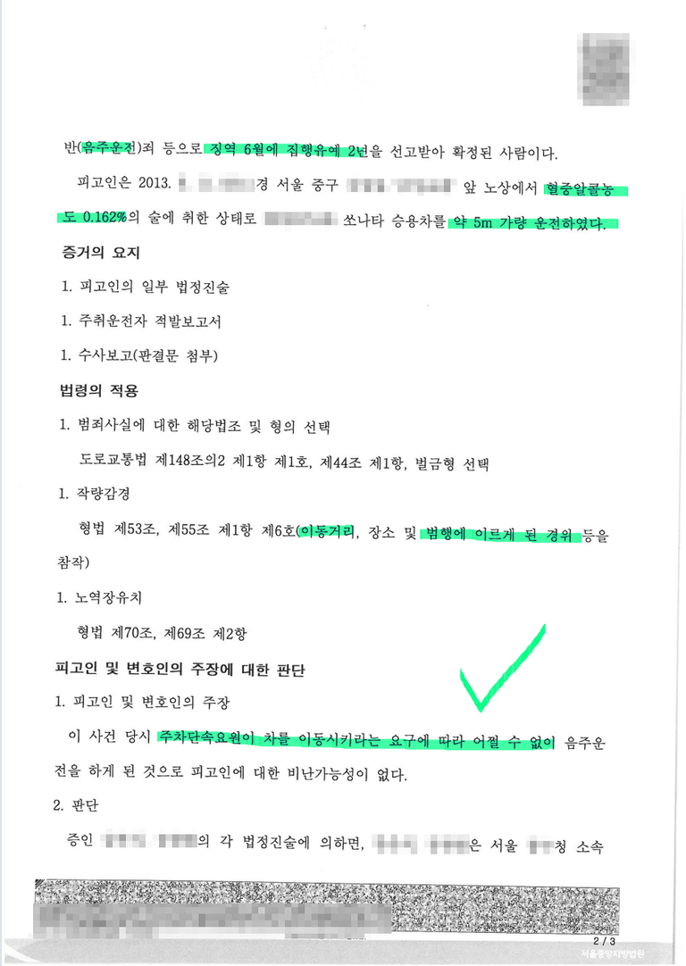 3회째 음주운전 이나, 주차단속요원을 피고인 자신이 직접 부르고, 음주운전 거리가 5미터에 불과하며, 단속요원과의 실랑이 때문에 어쩔 수 없이 운전하게 된 경위를 참작하여 벌금에 그친 사례