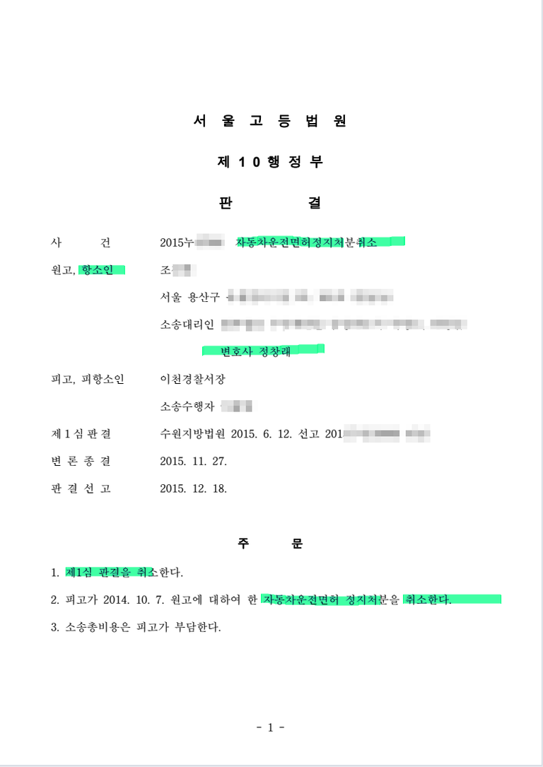 1심 행정소송에서는 취소소송 패소하였으나 2심에서 정창래변호사 선임하여