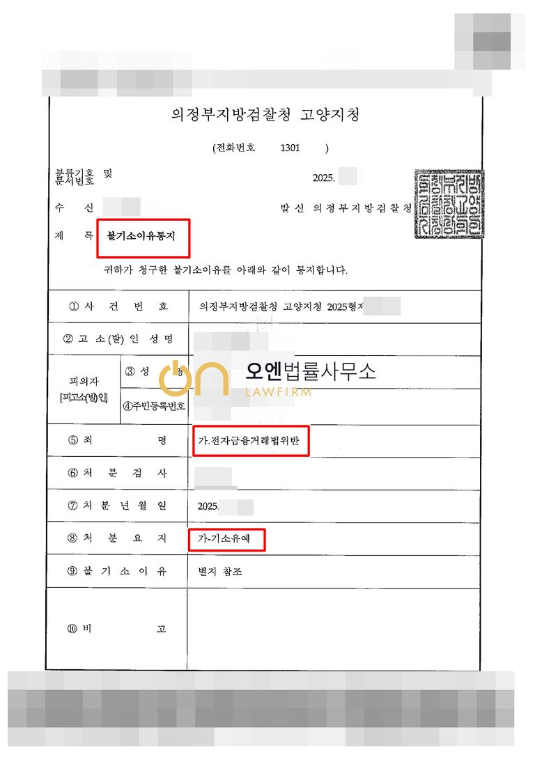 경찰은 담당변호사의 주장을 받아들여 전기통신금융사기피해방지및피해금환급에관한특별법 위반은 제외하였고, 검찰은 범행 경위 및 자수 사실을 기반으로 불기소처분(기소유예)의 선처를 내렸습니다.