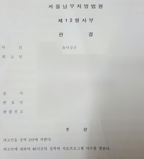이 사건 가해자는 범행을 부인하였기에 피해자와의 합의도 이루어지지 않아서, 유사강간으로 징역2년을 선고받았습니다.