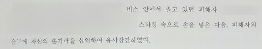 이 사건 피해자는 퇴근을 하고 버스의 맨 뒷자리 탔는데 피곤했던 하루였던지라 잠이 쏟아져서 자신도 모르게 깜빡 졸고 말았습니다. 그런데 이 사건 가해자가 옆자리에 앉았고 피해자의 하의 속으로 손을 넣어 음부에 자신의 손가락을 삽입하여 유사강간하였습니다. 이후 피해자는 놀라서 버스에서 내려 도망갔다가 다시 버스정류장으로 돌아와 바스를 탔지만 가해자와 또 같은 버스를 타게 되었고 두려운 마음에 신고를 하게 되었습니다.