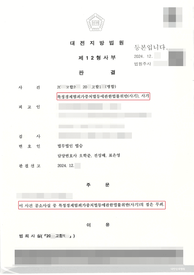 ![🚩[특경법] 7억 원 이상의 사기 혐의 의뢰인 무죄 판결](/_next/image?url=https%3A%2F%2Fd2ai3ajp99ywjy.cloudfront.net%2Fuploads%2Ftitleimage%2Foriginal%2F5c23344f227b15a91df80b76-original.jpg&w=3840&q=75)