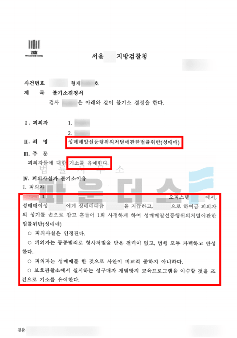 그 결과 의뢰인은 오피스텔 성매매 업소에 방문하여 유사성행위에 이르러 전과 등의 위기에 놓인 상황에서 기소유예 처분으로 사건을 마무리할 수 있었습니다.