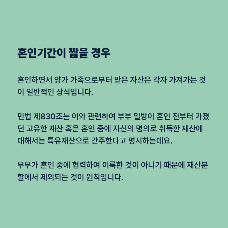 만일 결혼 기간이 길지 않다면 혼인하면서 양가 가족으로부터 받은 자산은 각자 가져가는 것이 일반적인 상식입니다. 민법 제830조는 이와 관련하여 부부 일방이 혼인 전부터 가졌던 고유한 재산 혹은 혼인 중에 자신의 명의로 취득한 재산에 대해서는 특유재산으로 간주한다고 명시하는데요. 부부가 혼인 중에 협력하여 이룩한 것이 아니기 때문에 재산분할에서 제외되는 것이 원칙입니다.