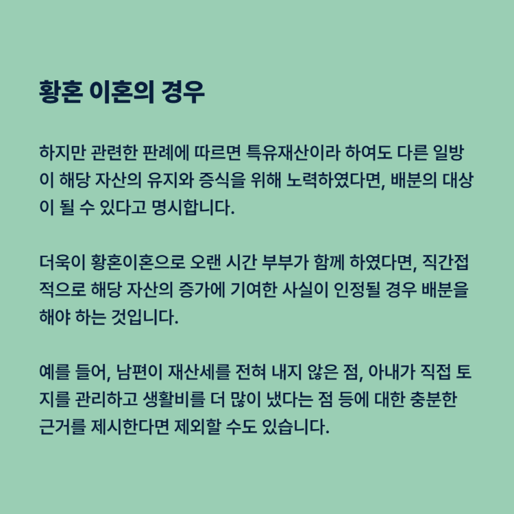 하지만 관련한 판례에 따르면 특유재산이라 하여도 다른 일방이 해당 자산의 유지와 증식을 위해 노력하였다면, 배분의 대상이 될 수 있다고 명시합니다. 더욱이 황혼이혼으로 오랜 시간 부부가 함께 하였다면, 직간접적으로 해당 자산의 증가에 기여한 사실이 인정될 경우 배분을 해야 하는 것입니다.