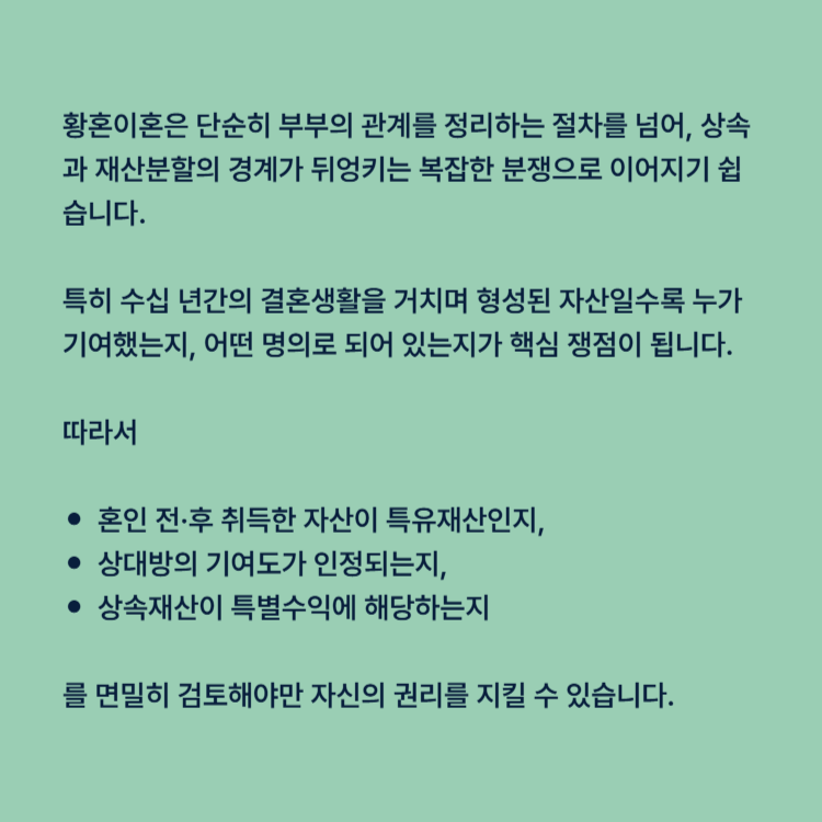 오늘은 황혼이혼 과정에서 상속재산 분할이 쟁점이 된 실제 사례를 통해, 법적으로 어떤 대응이 필요한지 살펴보겠습니다.