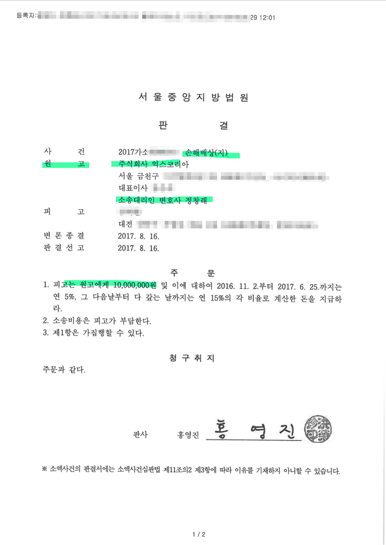 1천만원 전부 승소