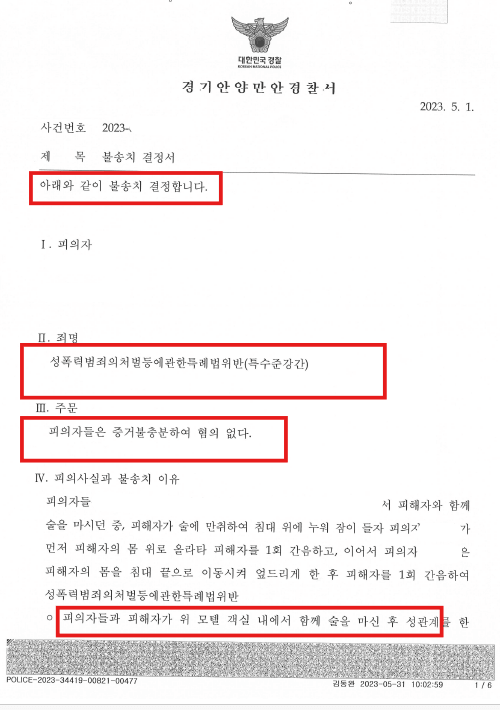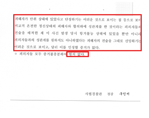수사상황: 피해자 진술 위주로 수사 개시, 피고소인들에 대한 강제추행·특수준강간 혐의로 조사 진행 가능성 존재.