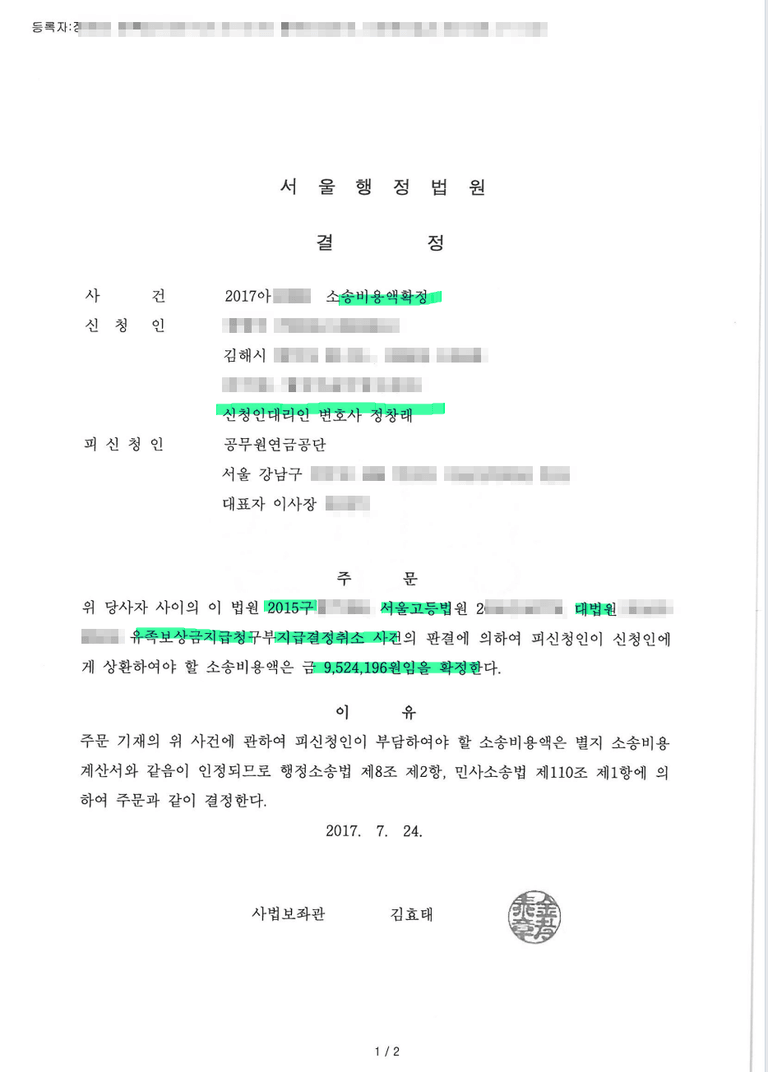 소송비용으로 952만원 가량 전부를 지급받은 사례