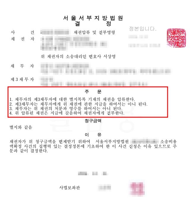 결국 법원은 임대차보증금반환 채권압류 전부명령을 인용하였으며, 제3채무자인 임대인은 의뢰인에게 해당 보증금을 직접 변제할 의무를 지게 되었습니다.