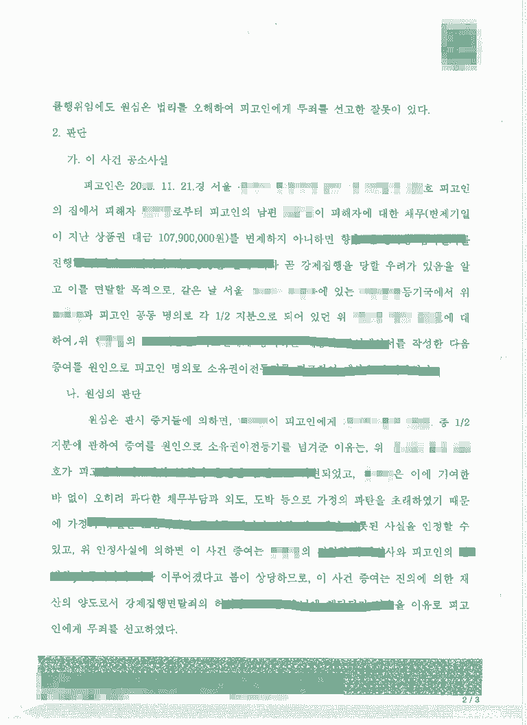 채권자가 강제집행면탈로 고소한 사례에서 무죄를 받은 사례