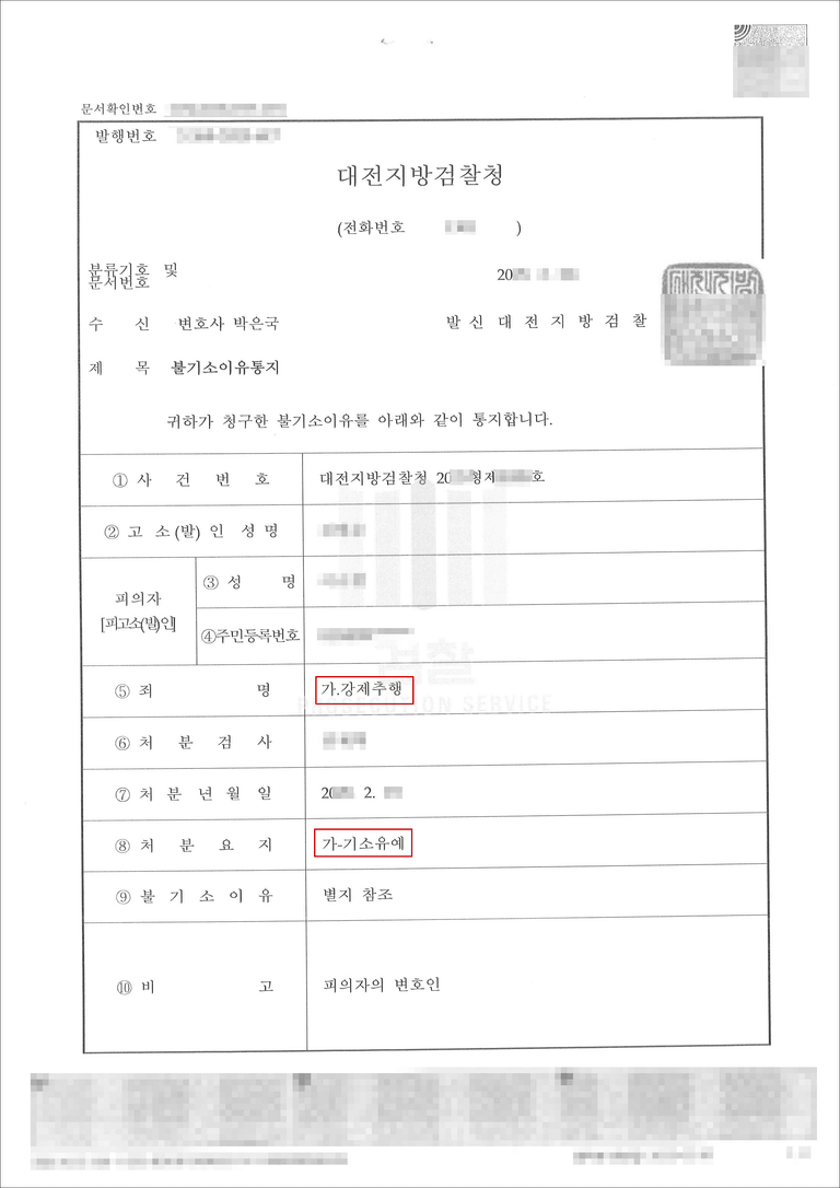 그 결과 검찰은 법무법인 법승 대정형사전문변호사 의견을 받아들여 해당 사건에 별도의 전과기록이 남지 않는 기소유에 불기소 처분을 하였습니다.