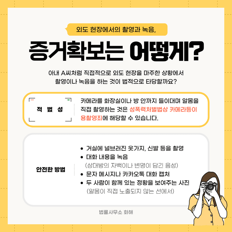 단, 문을 강제로 열거나, 상대방이 촬영을 거부하는데도 계속 촬영하거나, 알몸을 직접 찍는 행위는 오히려 형사처벌로 이어질 수 있습니다. 증거는 확실해야 하지만, 반드시 법 테두리 안에서 확보해야 재판에서 효력이 있고, 스스로를 보호할 수 있습니다.